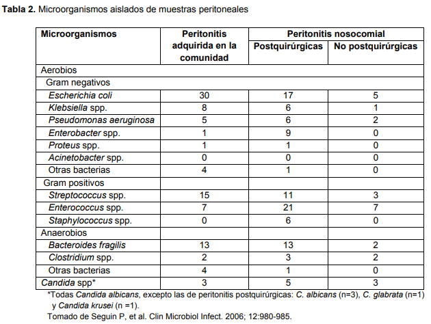 - En las peritonitis de adquisición nosocomial y las comunitarias con tratamiento antimicrobiano previo predominan los aerobios y facultativos, disminuye el porcentaje de E. coli a favor de Enterobacter spp. Se aísla P. aeruginosa y predominan aislamientos de Enterococcus spp. y levaduras (C. albicans y C. glabrata)